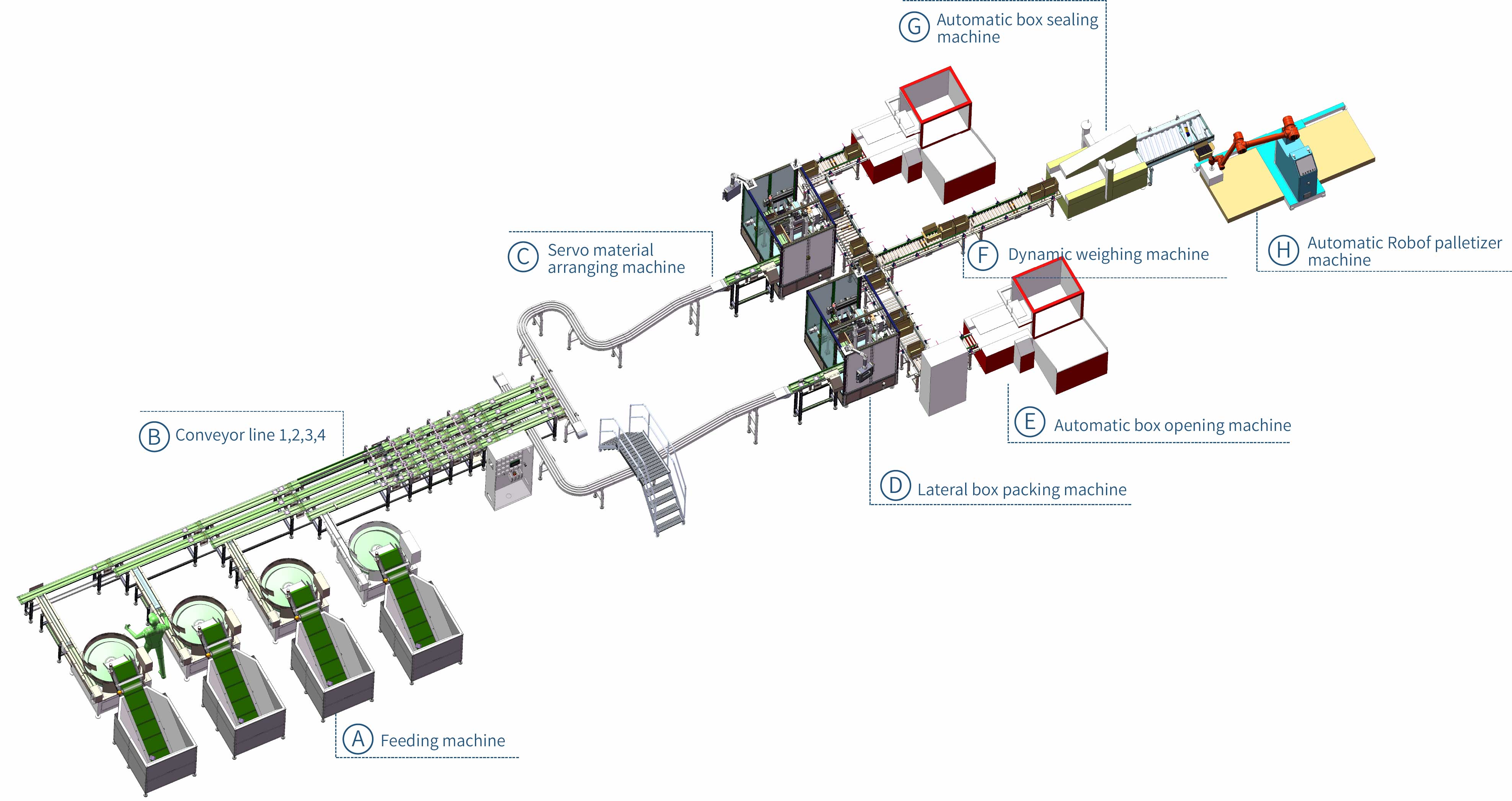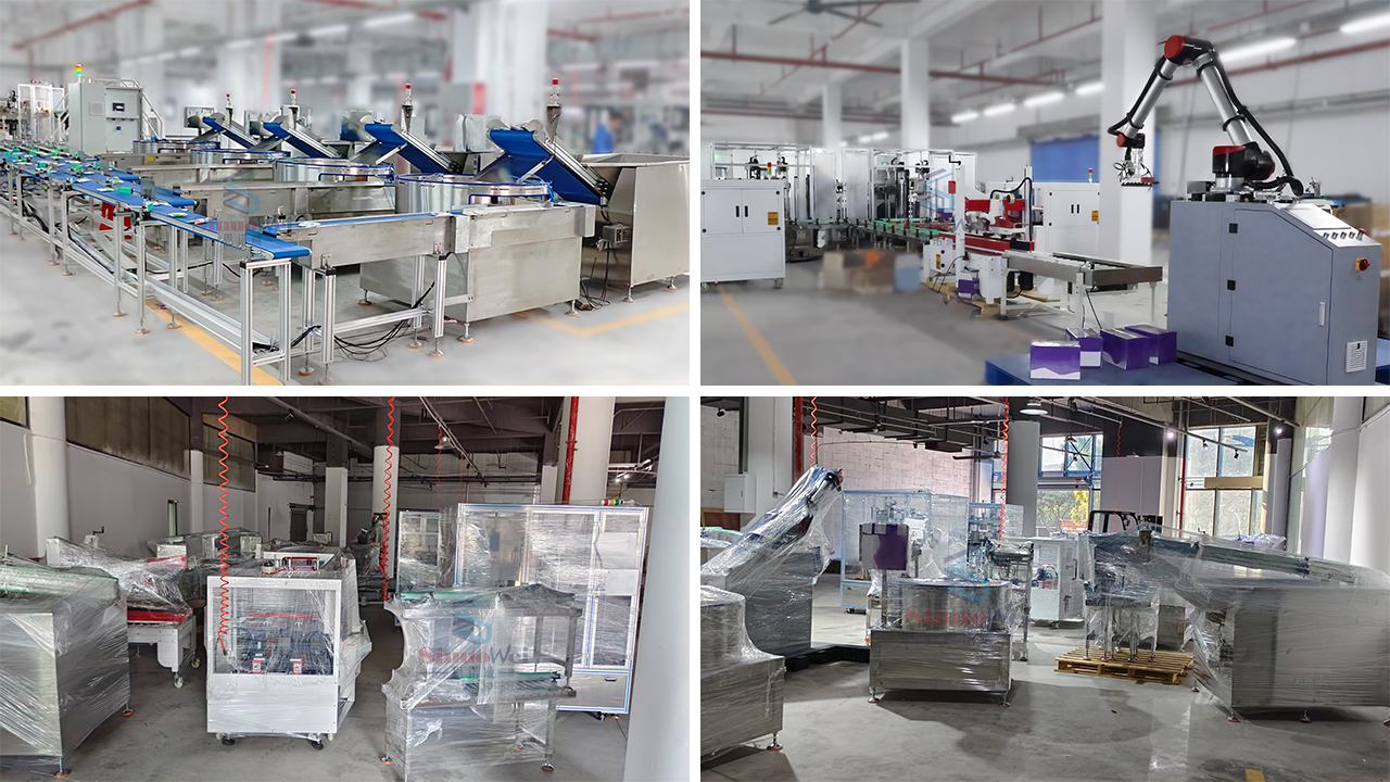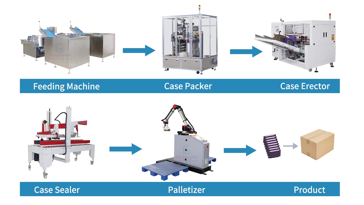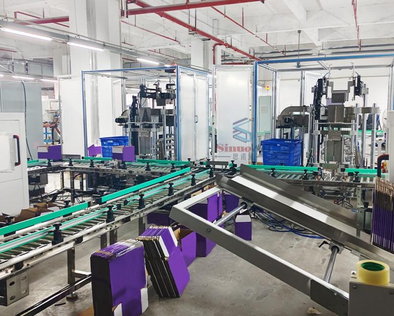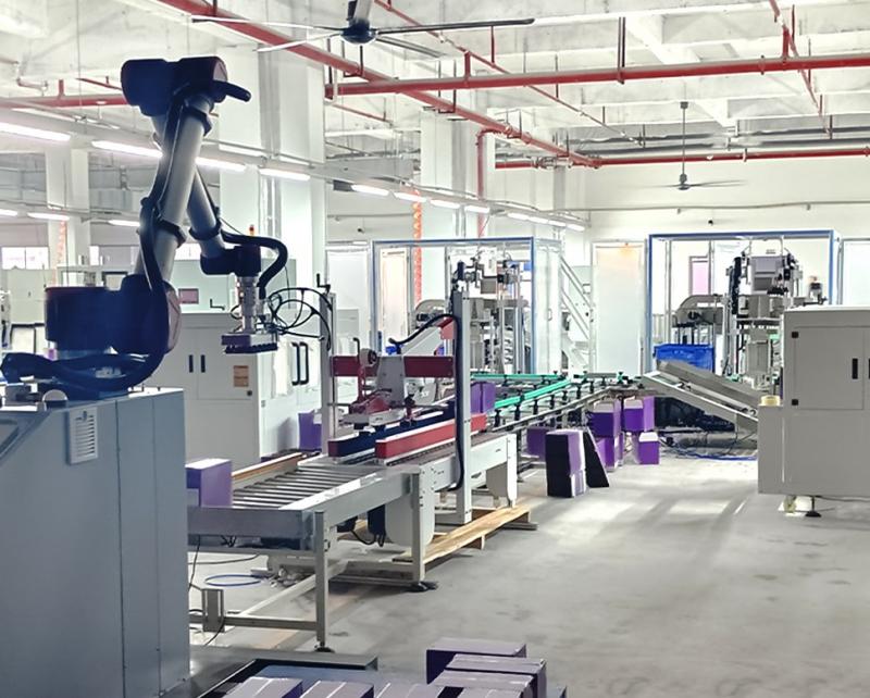 La linea di confezionamento automatico per alimenti consente l'automazione completa del processo, dai prodotti insacchettati all'inscatolamento e alla pallettizzazione. Gli operatori devono solo versare i prodotti alimentari nel vassoio di alimentazione e l'apparecchiatura completerà automaticamente attività come l'allineamento dei materiali, l'inscatolamento, la sigillatura e la pallettizzazione. Ciò aumenta significativamente l'efficienza produttiva, riduce i costi di manodopera e garantisce un processo di confezionamento ad alta velocità, stabile e standardizzato.